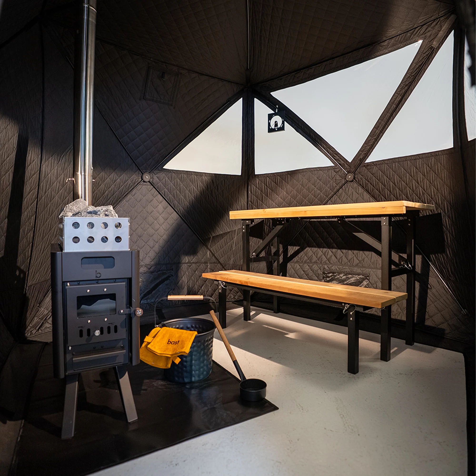 – Šator za saunu i torbe za nošenje – Peć i torbe za nošenje – Kolci za pod i užad za vjetar – Uklonjiva podnica – Vatrootporna podloga za peć – Sklopive klupe – Kanta i kutlača – Košara za kamenje – Rukavice otporne na toplinu – Kamenje za saunu 20 kg – 2 kape za saunu od 100% vune – Zaštita od vremenskih uvjeta – Termometar